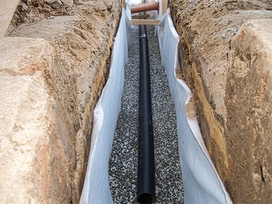 Правильная укладка дренажной трубы с геотекстилем — залог долговечности системы.