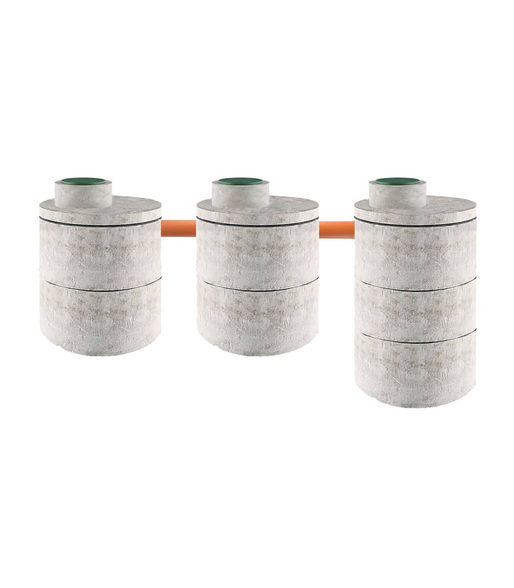 Трехкамерный септик по схеме «2+2+3». Система состоит из последовательных колодцев. Наличие двух камер-отстойников позволяет добиться практически полной прозрачности стоков перед их попаданием в финальный дренажный колодец.