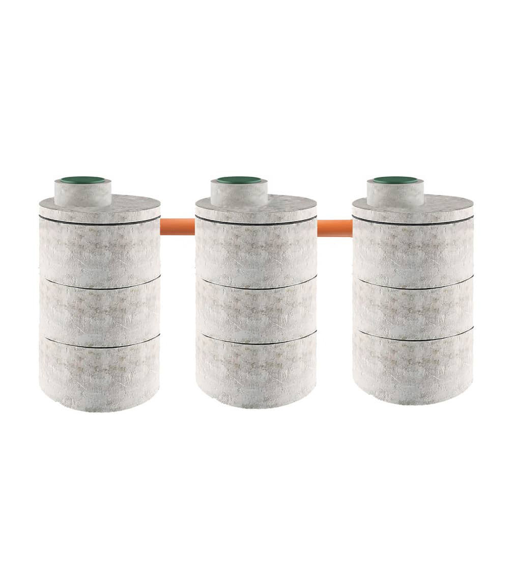 Схема «3+3+3» - полноценное очистное сооружение, состоящее из трех независимых колодцев по 3 кольца в каждом. Благодаря трехступенчатой системе отстаивания, на выходе получается максимально осветленная вода.