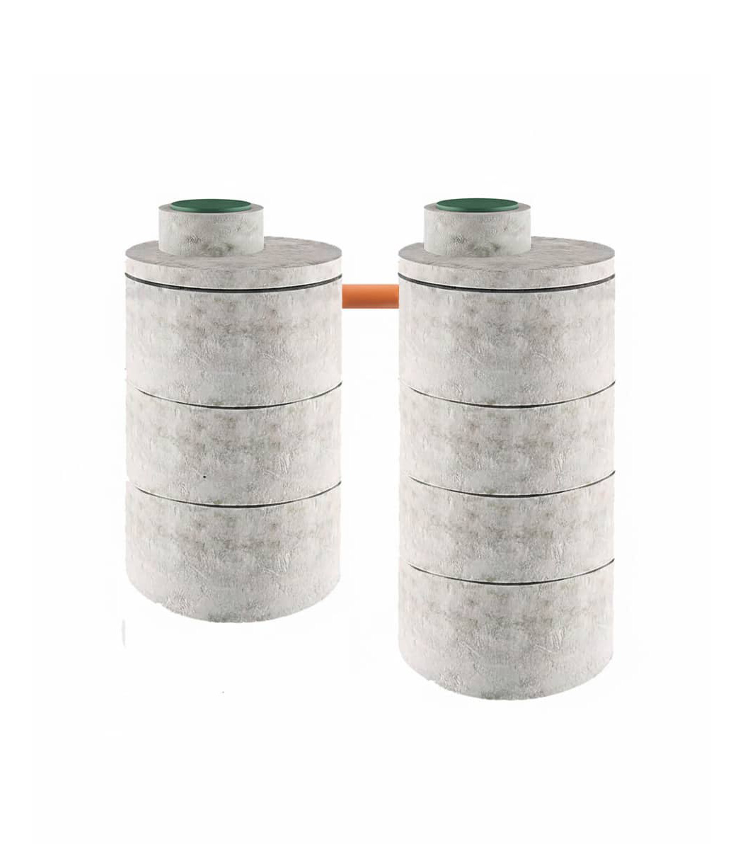 Модель септика состоит из двух последовательных колодцев: приемной камеры (3 кольца) и дренажного колодца (4 кольца).