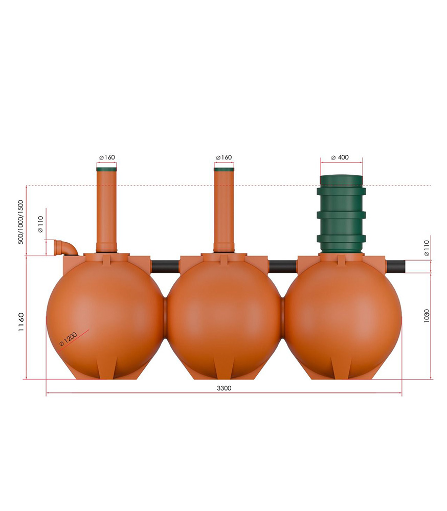 - Две широкие горловины Ø 400 мм + Ø 160 мм — удобная и быстрая откачка ила любой ассенизаторской машиной.